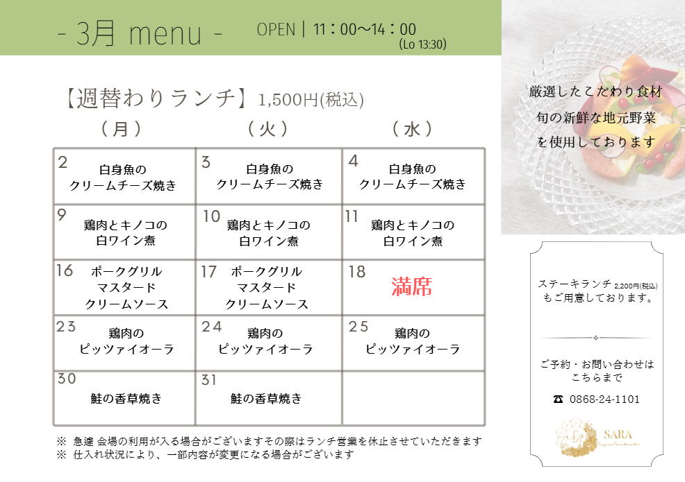 3月のメニューのお知らせです☆