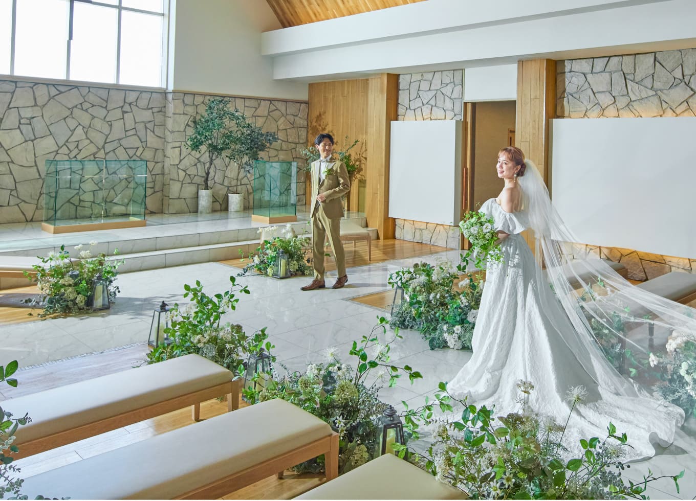 天然の木と石に包まれた新しい空間は、正面の窓から差し込む光が祭壇をやさしく照らします。11mのバージンロードと象徴的なクロスバージンロード、80名収容のゆとりあるチャペルです。
