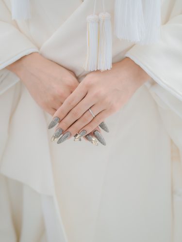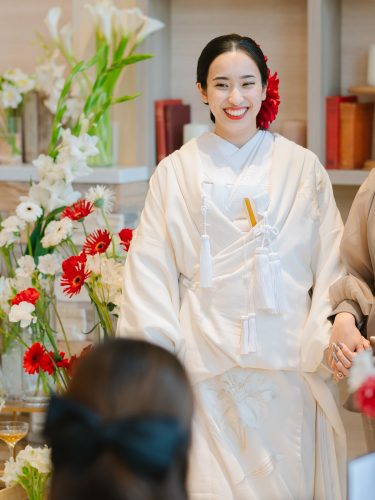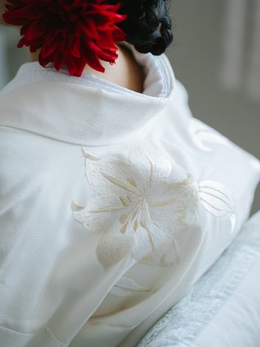 シンプルな白無垢にヘアスタイルは赤の大ぶりな装花でメリハリをつけ