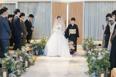 バージンロードをお花で清め、新婦様をお迎えします